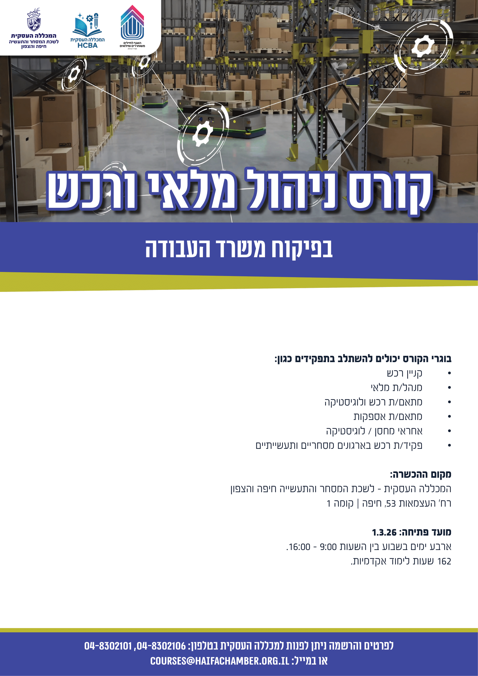 רוב הקורסים מתקיימים פרונטלית – באווירה לימודית נוחה ומזמינה, במתחם לשכת המסחר ברחוב העצמאות 53, חיפה – מיקום מרכזי ונגיש לתחבורה ציבורית.