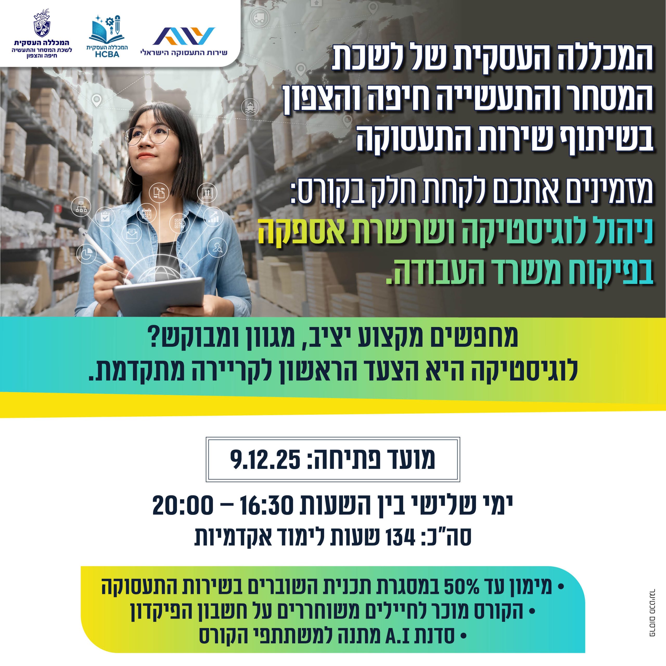 המכללה העסקית של לשכת המסחר והתעשיה חיפה והצפון שמחה להודיע על פתיחת קורס ניהול לוגיסטיקה ושרשרת אספקה בפיקוח משרד העבודה.